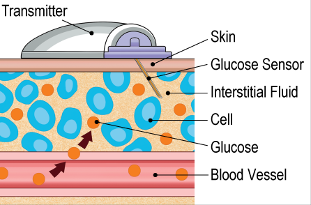 -혈관 내의 포도당(글루코오스)이 간질액으로 들어가게 되고, 글루코오스 센서 표면의 산화효소를 통해 포도당이 분해되면서 과산화수소가 형성됩니다.