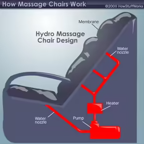 안마의자의 등받이 쪽에는 막이 들어있는데, 이것이 방수 역할을 한다. 노즐을 통해 이 막에 물을 강하게 분사하면 충격이 막에 가해지고 이는 이어서 사용자에게 전달된다. 물의 압력이 변함에 따라 충격의 크기와 막의 형태가 변한다.